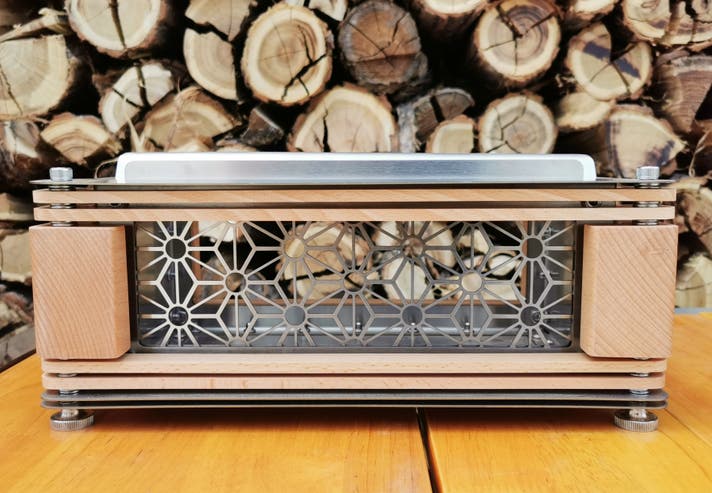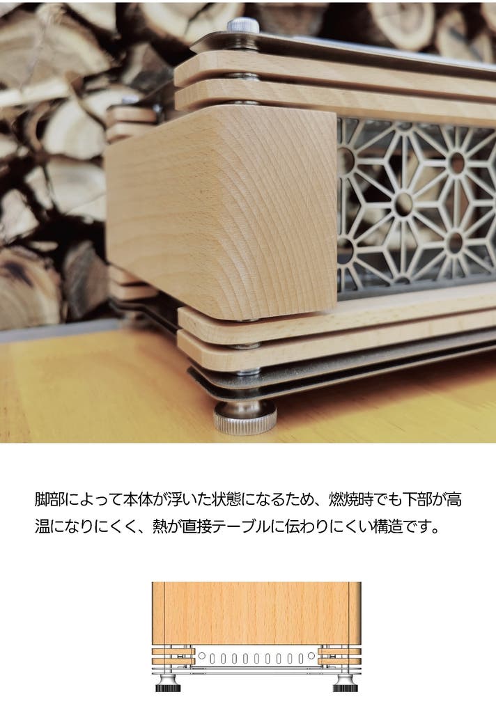 構造:本体は内層と外層の二重構造。外層は無垢木材を使用し、内層は燃焼室をリベット固定。通気・断熱のための空間およびガラス差し込み用のスロットを設置。