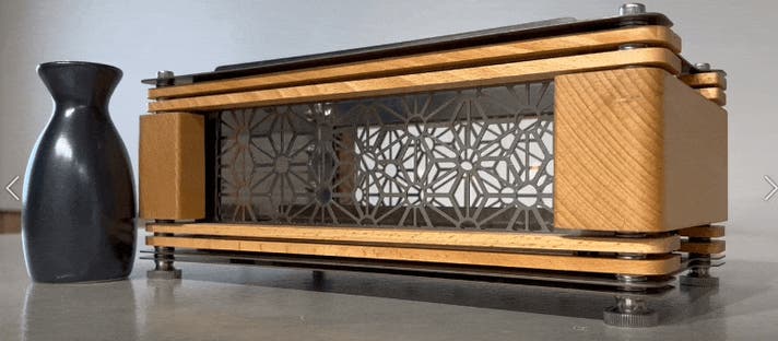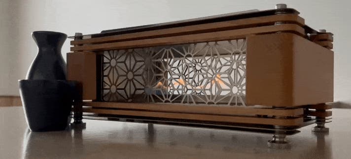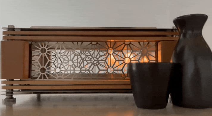 伝統的な和の文様を透かして、炎の揺らめきを美しく映し出す板。