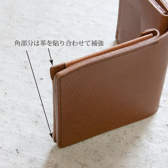 角部分は、カードエッジ部分の保護目的として、裏面に革片を貼り合わせて補強をしています。