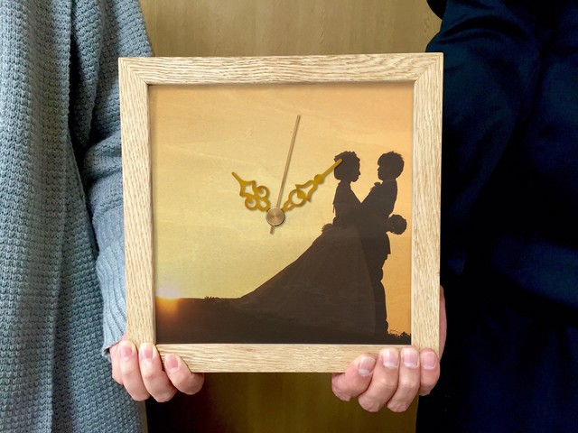 今まで出来なかった木のキャンバスに思い出を残すことが出来る新しい写真の時計です。大切な人との思い出、これから結婚するカップル、お孫様の写真、お気に入りの写真など、うっすらと入る木目が木の温もりを身近に感じられ、いつも優しい気持ちを持つことができます。