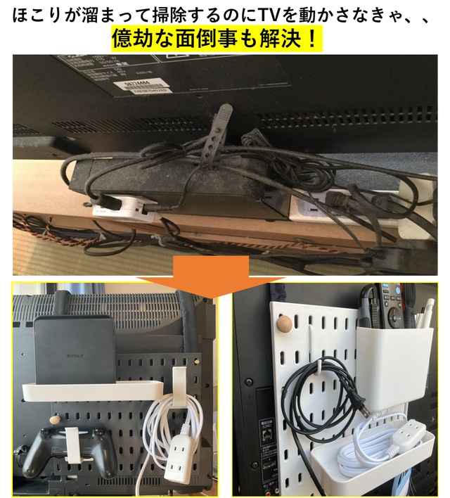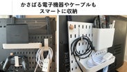 配線や置き場所に困るモデム、コントローラー等は浮かせてまとめる事で床にほこりを寄せ付けません。
