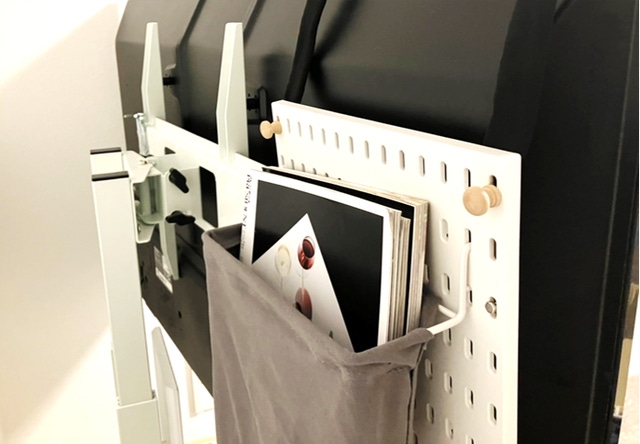 布製のバケットでは雑誌やDVD、ゲームソフトも収納可能。