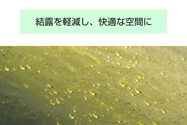 coodyのテントに使われているポリコットン素材は、吸湿性・通気性に優れ、温度変化にも強いため結露が発生しにくい特長があります。コットン繊維が水分を吸収し、繊維の隙間から空気が流れることで湿気を外に逃がし、適切な湿度を保ちます。その結果、蒸し暑さや不快な結露を抑え、常に快適な室内環境を実現します。