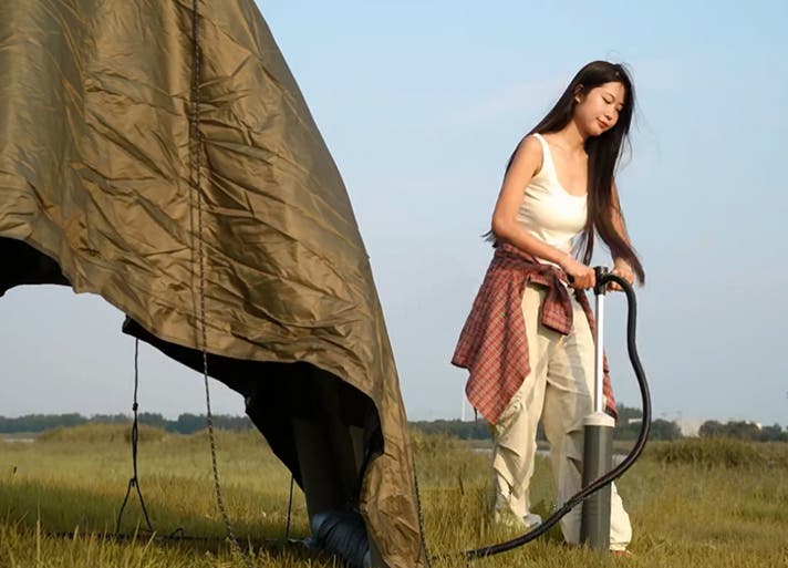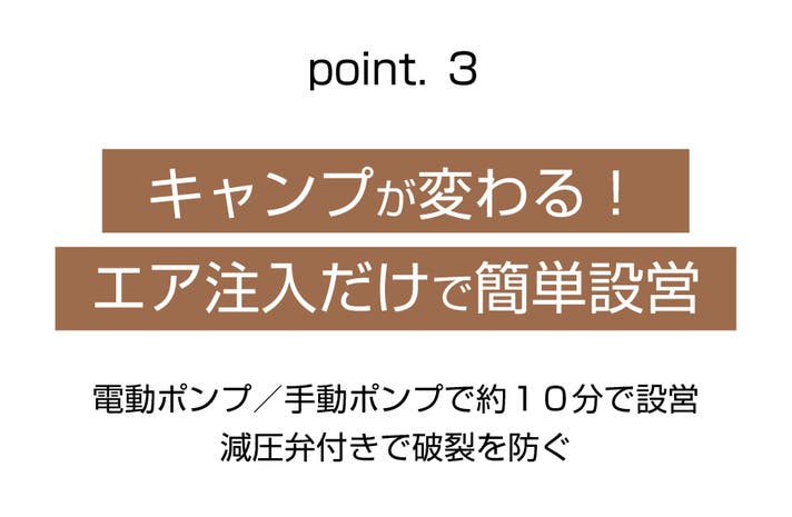 テントを広げて空気を入れるだけの簡単設営。付属の手動ポンプなら数分で設営可能。設営に不安がある方や、時間を節約したい方にぴったりです。
