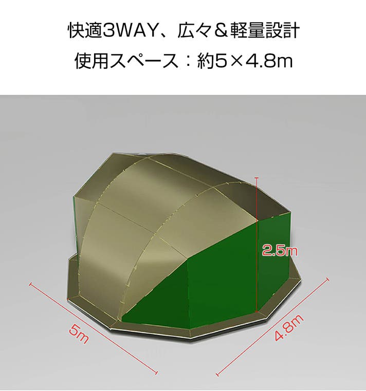 高さ約2.5mの天井高により立ったまま移動でき、幅4.8m × 奥行5mの広々とした空間にはダブルサイズのエアベッドを複数設置することも可能。