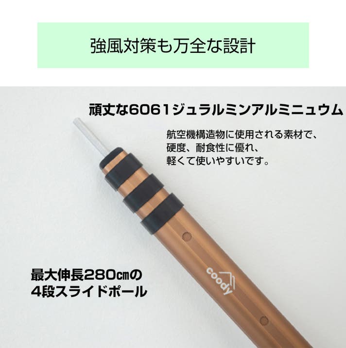 太さ30mmの極太アルミポールは耐風性・耐圧性に優れ、厚みのある構造で耐久性もアップ。風に強く、長く使えます。