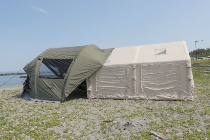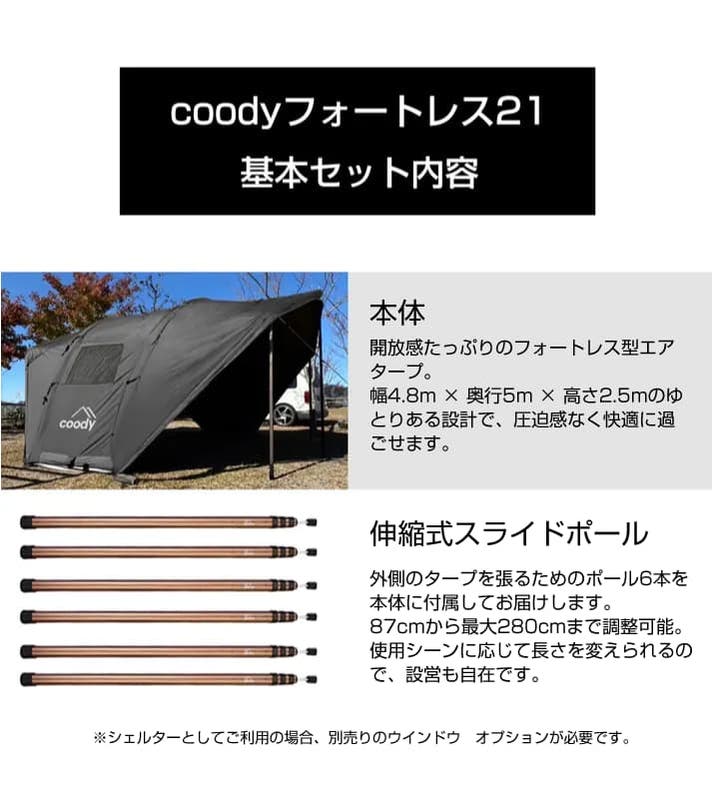 - coodyらしさあふれる居住性はそのままに、軽量なタープになりました。エア注入で簡単設営