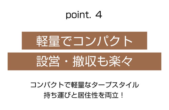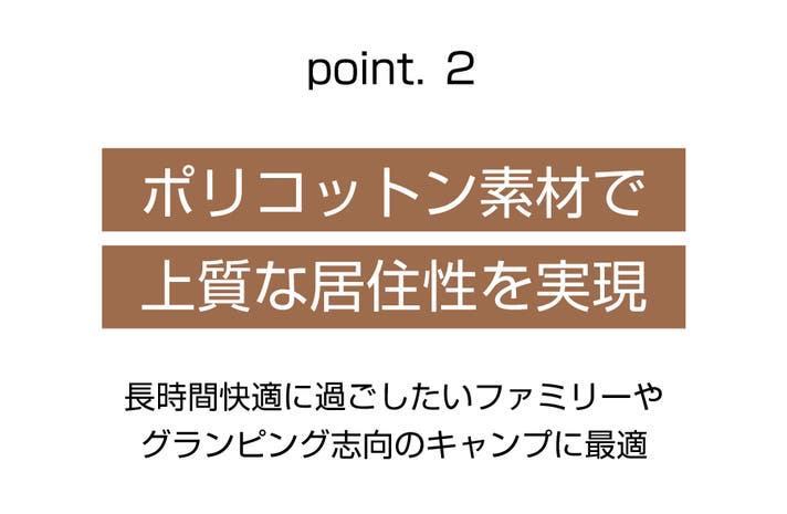 さらに、厚みのある生地が結露や蒸れを抑え、テント内の湿度をコントロール。上品な質感と落ち着いた雰囲気が、屋外にいることを忘れるほどのくつろぎをもたらします。持ち運べる自分だけのグランピング空間を演出します。