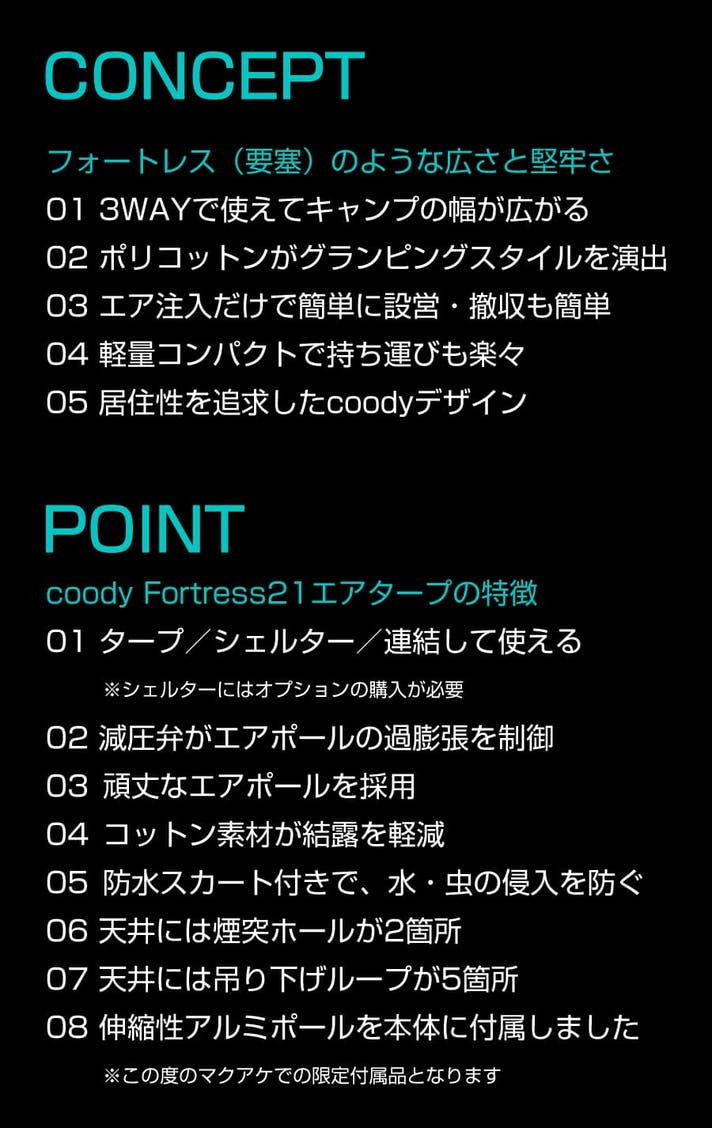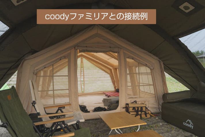 従来のcoodyテント(8.0、10.0、13.6、ファミリア)と接続可能で、フォートレス21エアタープを前室としてリビングスペースの拡張に活用できます。