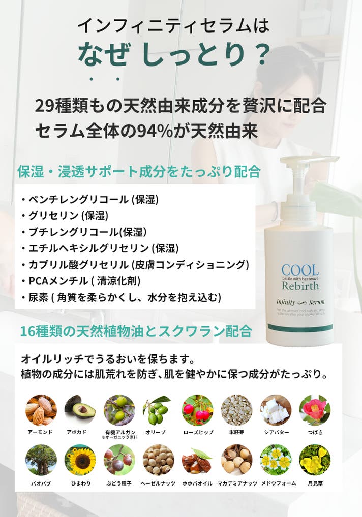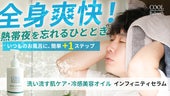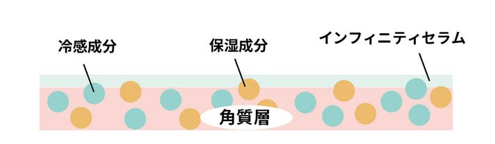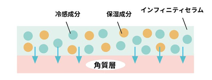 『インフィニティセラム』は、オイルが冷感成分を包んで肌にとどめ、セラムごと角質層に浸透、肌になじんで保湿成分と冷感がとどまります。