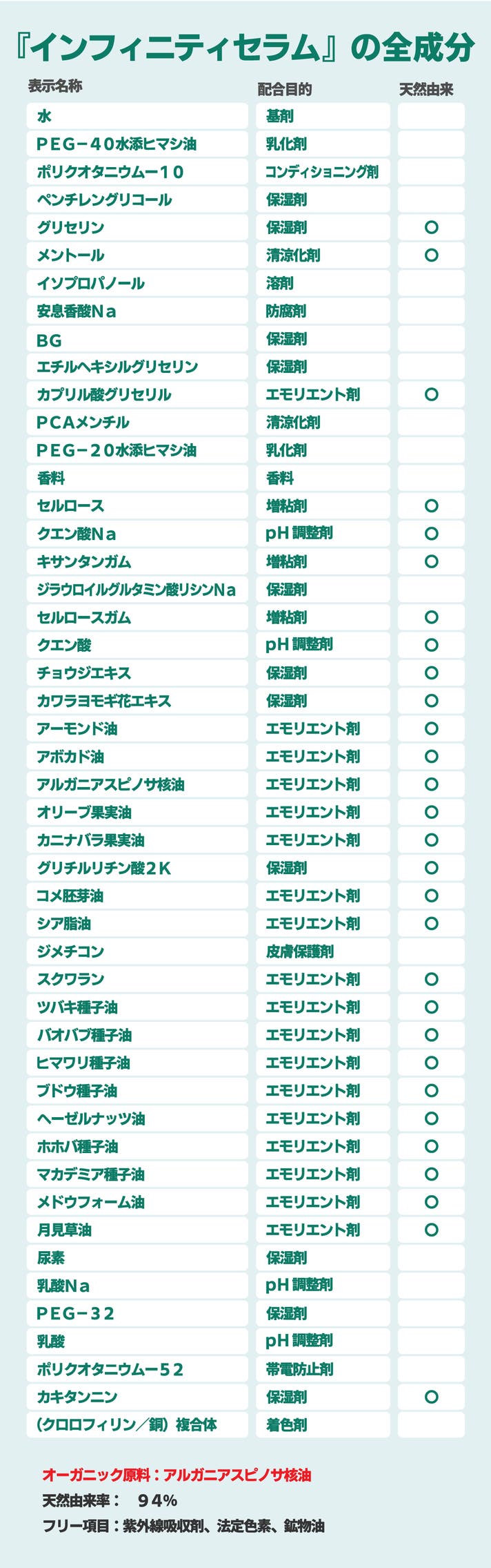 水、PEG-40水添ヒマシ油、ポリクオタニウムー10、ペンチレングリコール、グリセリン、メントール、イソプロパノール、安息香酸Na、BG、エチルヘキシルグリセリン、カプリル酸グリセリル、PCAメンチル、PEG-20水添ヒマシ油、香料、セルロース、クエン酸Na、キサンタンガム、ジラウロイルグルタミン酸リシンNa、セルロースガム、クエン酸、チョウジエキス、カワラヨモギ花エキス、アーモンド油、アボカド油、アルガニアスピノサ核油*、オリーブ果実油、カニナバラ果実油、グリチルリチン酸2K、コメ胚芽油、シア脂油、ジメチコン、スクワラン、ツバキ種子油、バオバブ種子油、ヒマワリ種子油、ブドウ種子油、ヘーゼルナッツ油、ホホバ種子油、マカデミア種子油、メドウフォーム油、月見草油、尿素、乳酸Na、PEG-32、乳酸、ポリクオタニウムー52、カキタンニン、(クロロフィリン/銅)複合体