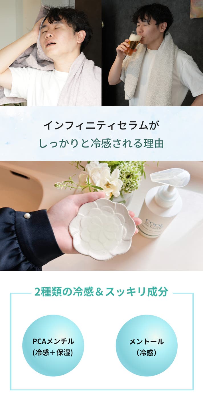 『インフィニティセラム』を塗り込んだ肌の上からスプレーすると爽快感がさらにワンランクアップします。
