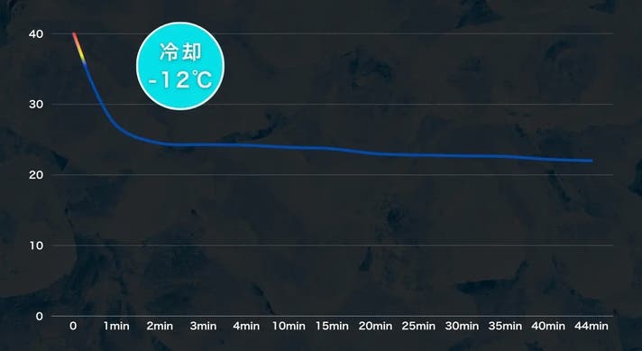 ※冷却プレートの表面温度は、環境温38℃の条件下で、44分後に温度が24℃まで低下します。