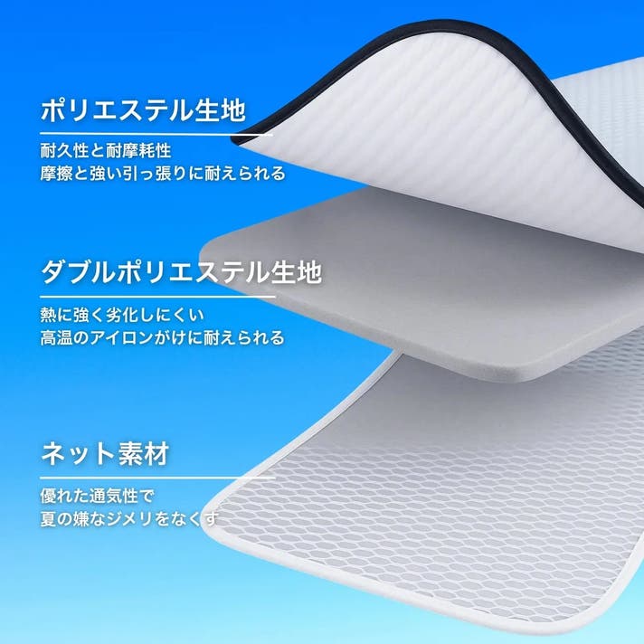 表面は摩耗に強く、毎日の使用でも型崩れしにくい高耐久素材を使用。中層は熱に強く、アイロンの高温にも対応できる設計で、お手入れも安心。さらに、通気性に優れたネット素材が湿気を効果的に逃がし、ムレを防いでいつでもサラッと快適。
