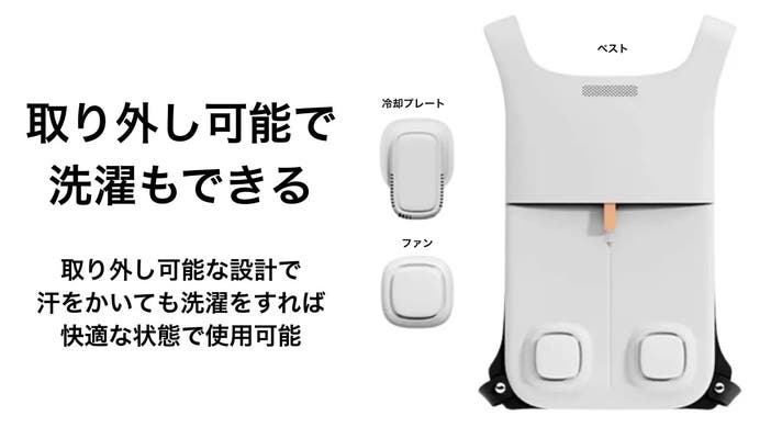 汗をかいても、ベスト部分だけ洗濯できる設計だから、いつでも清潔。冷却プレートやファンは簡単に取り外せるため、お手入れもラクラク。快適さと衛生面を両立した、実用的な構造です。