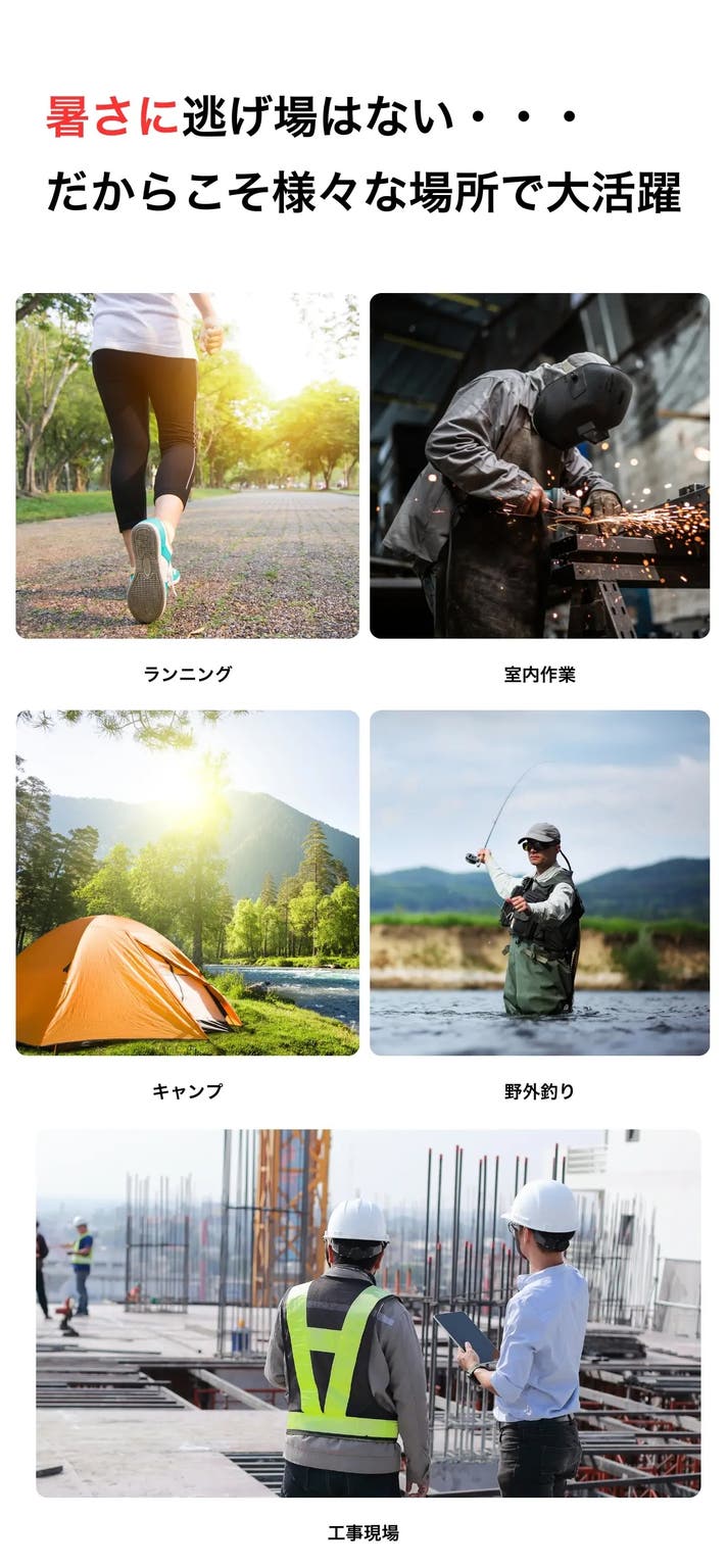 夏の厳しい暑さは、屋外・屋内問わず避けられません。だからこそ、このアイテムは、ランニング、室内作業、キャンプ、釣り、工事現場などあらゆるシーンで快適さをキープ。軽量・やさしい稼働音・長時間稼働で、どこでも“涼しさ”を届けます。