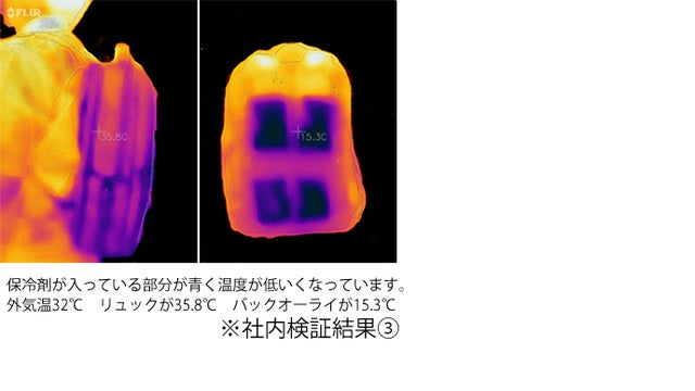 外気温32℃で背中パットを3時間使用した結果、装着面(体;背中と背中パット間の温度)が約20℃で外気温より10℃低い状態が約2時間キープできるという結果が出ました。これで気になる背中の汗も軽減されます。(社内検証結果)