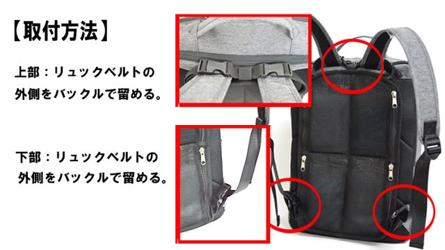 リュックの上下ベルトに通して、パットを固定してください。取り付けは簡単。左右のショルダーベルトの上側と、下側に付属のゴムベルトを通して留めるだけ。お持ちのリュックのショルダーベルトのサイズに合わせて長さを調節してください。