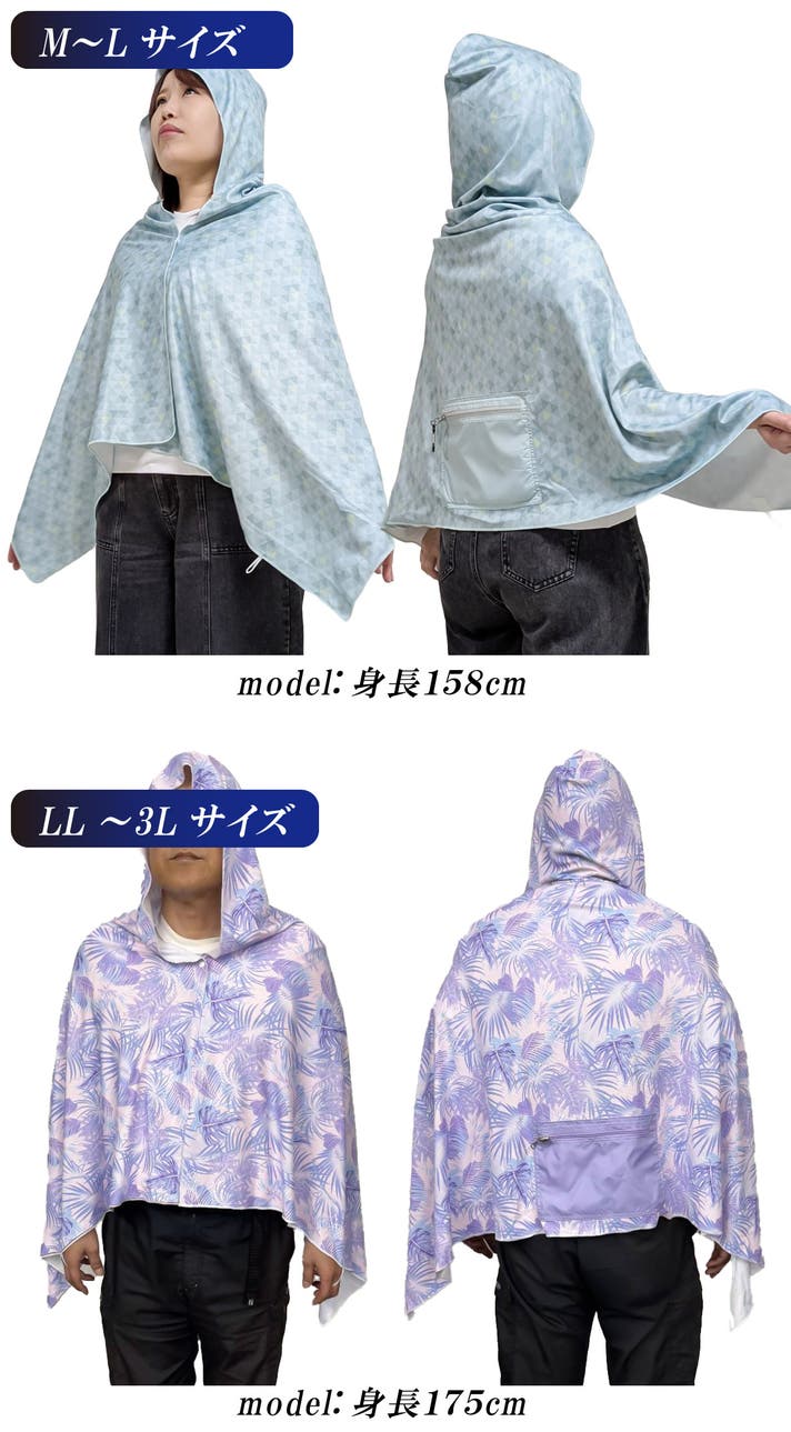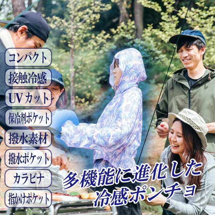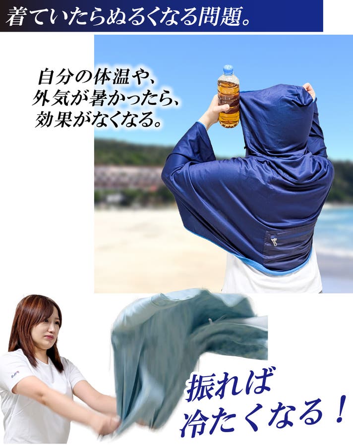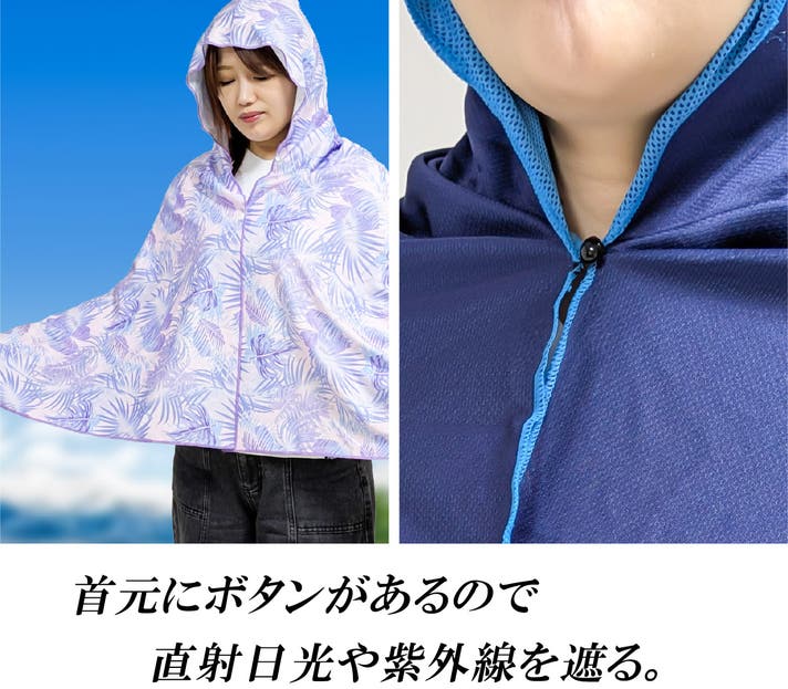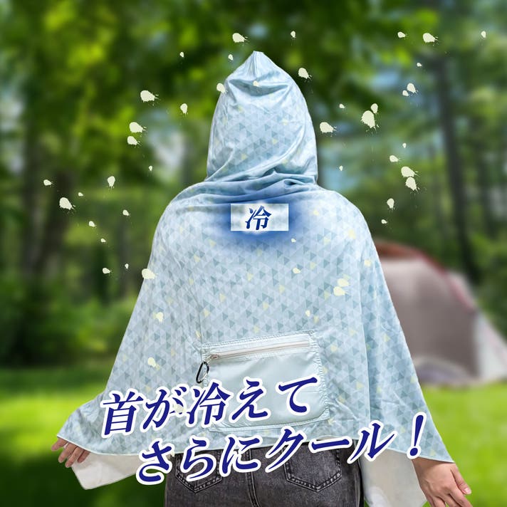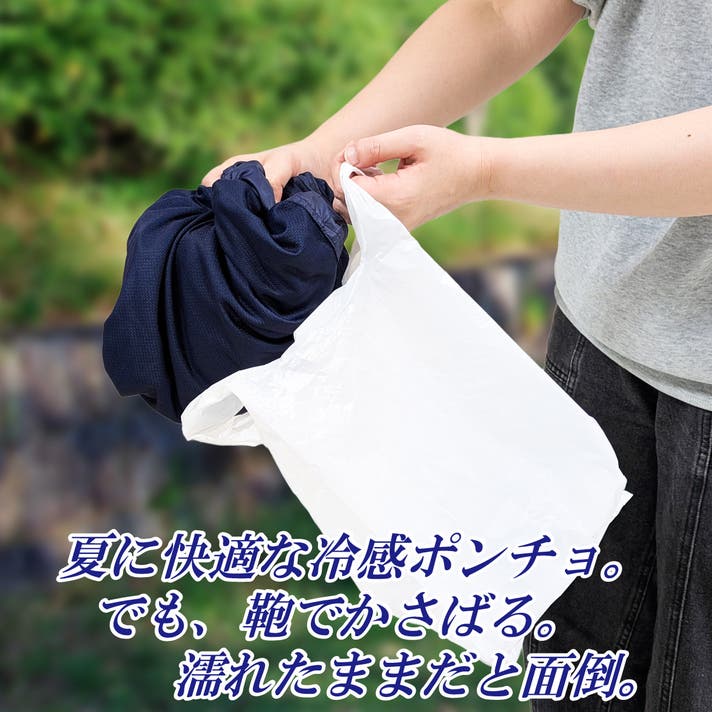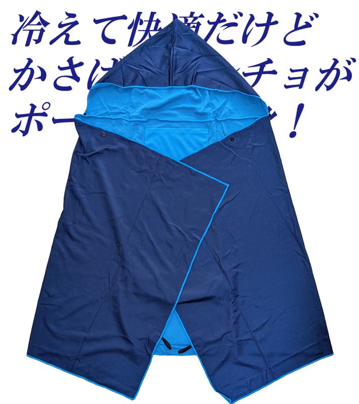 - 濡らして振るだけ、ひんやり持続。気化熱のチカラで暑い夏を快適に過ごす冷感ポンチョ