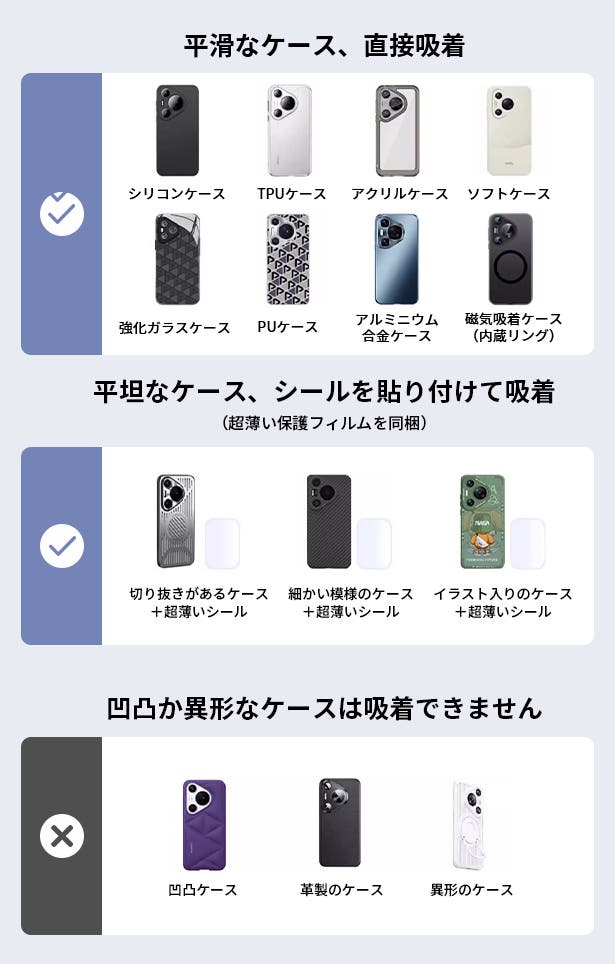 わざわざケースを外して直接端末に吸着必要がないです。平滑なケースに直接に吸着して反応してくれます。超薄い保護シールを同梱されているので、ケースに貼り付けて使用もOKです。