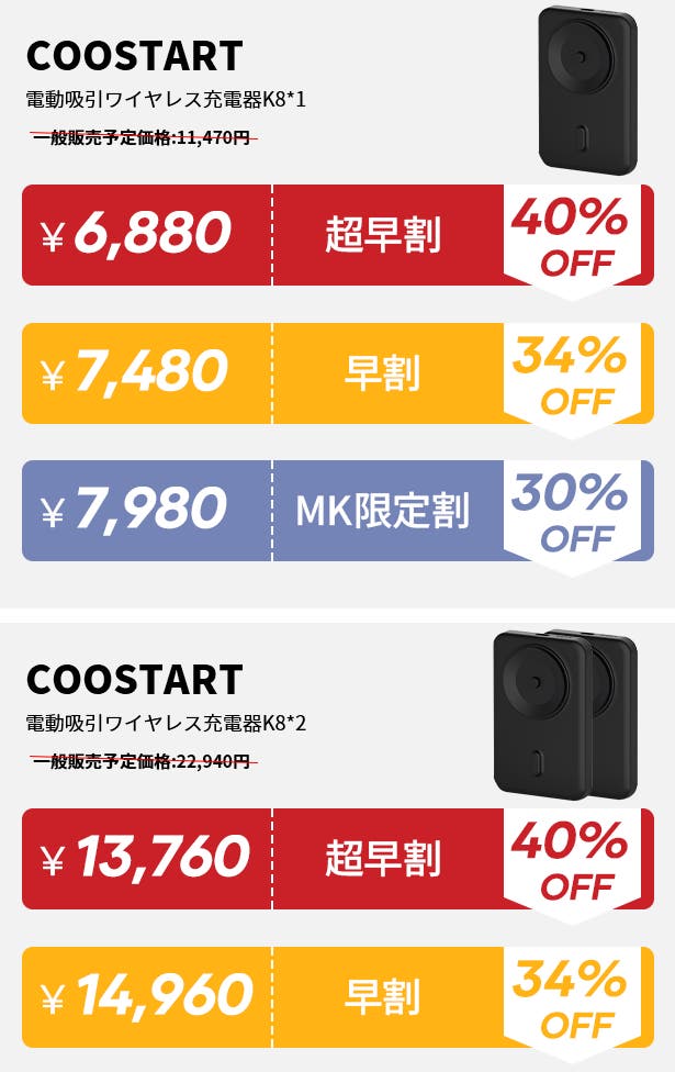 【超早割】COOSTART K8電気吸着バッテリー×2(40%OFF)