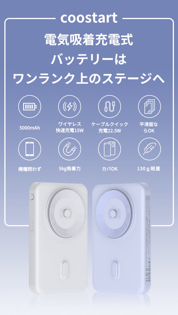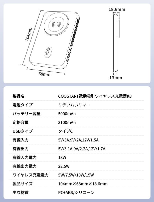 COOSTART K8は機種を問い合わず、端末はワイヤレス充電機能が搭載されるなら、端末に電動真空吸着し充電開始です。Magsafe機能が不要、磁石リンクが不要、充電ケーブルも不要です。