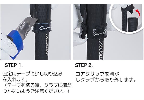 コアグリップは男性用と女性用があり、それぞれ標準サイズで製作しました。取り付ける前に長さを調節することができます。(5〜20mm)取り付け方法は、同封の取扱説明書をご確認の上、下記の事項をご参考ください。