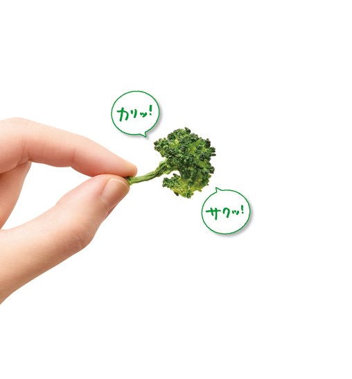 素材は国産ブロッコリーだけを使い、塩・油は一切使用せずに甘味料(トレハロース)だけで味を調え、加熱と乾燥で素材の持つ旨味を凝縮!丸ごと食物繊維なので硬いですが、その分フライ菓子などと違い長めに噛み続けられます。食感も珍しくサクッ!カリッ!パリッ!と一袋で3種類を楽しめます。見た目もブロッコリーそのままで、色鮮やかな緑に出来上がりました。