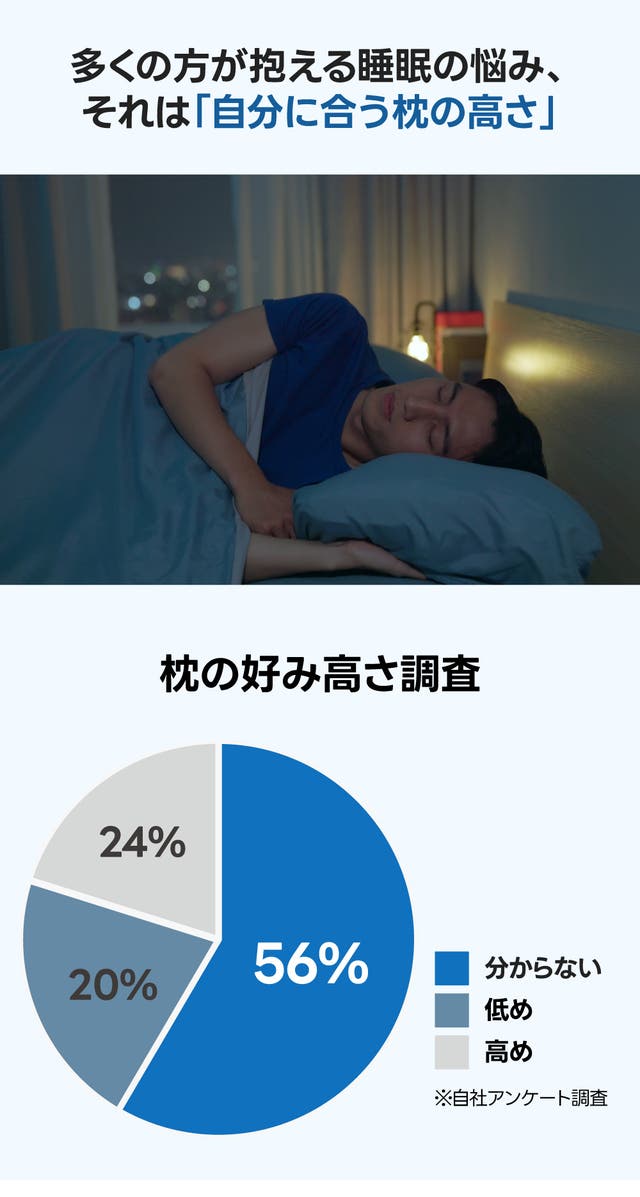 当社が実施したアンケート結果によると、自分に合った枕の高さが「わからない」と回答した方が、なんと50%以上にも上りました。高さが合わない枕を使用していると、頻繁に寝返りを打ってしまったり、首や肩に負担がかかり、朝起きたときにスッキリ感を得るのが難しくなります。