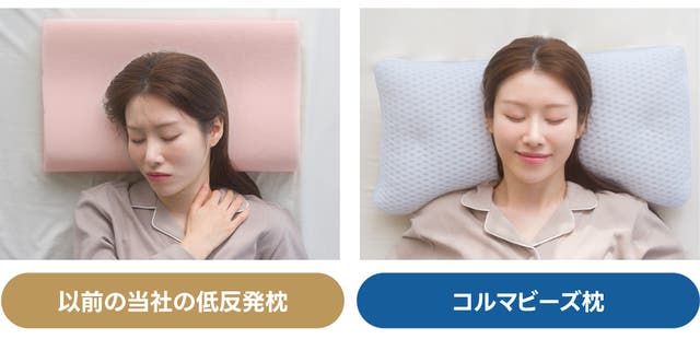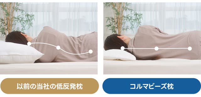 以前の当社の低反発枕は、高密度素材を使用しており、頭の重さに関係なくしっかりとした使用感が特徴でした。 コルマビーズ枕は、無数のビーズが動くことで、寝ている間の動きに合わせて形状が調整される設計になっています。