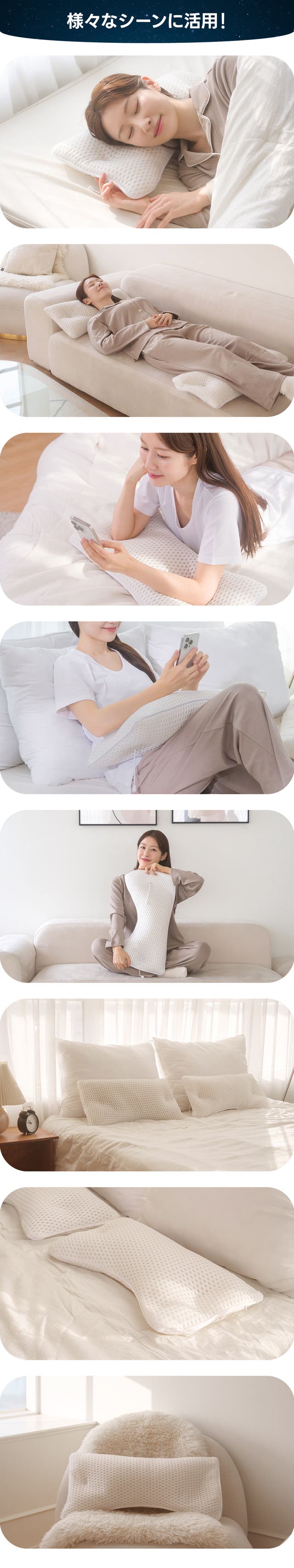 また、この枕はさまざまな頭の形にフィットするようにカスタマイズが可能で、どなたにも心地よくお使いいただけます。
