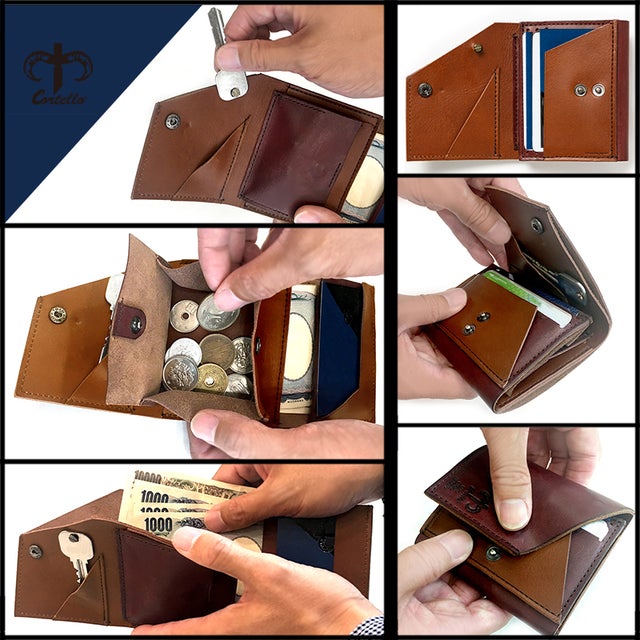 一般的なカードケースと同じぐらいのサイズながら、お札・小銭・クレジットカード・鍵・名刺などを収納できる3つ折りの多機能財布です。