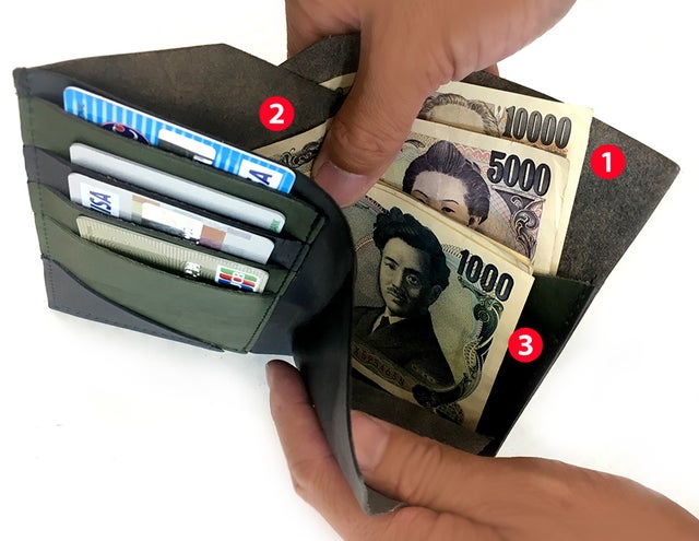 札入れ部分が3つに分かれているので、紙幣・レシートの整理には最適な仕様です。