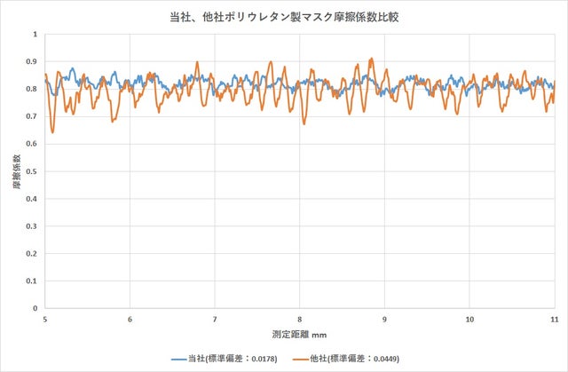 摩擦測定を実施したところ他社ポリウレタンマスク素材と比べて摩擦高い結果が得られました。