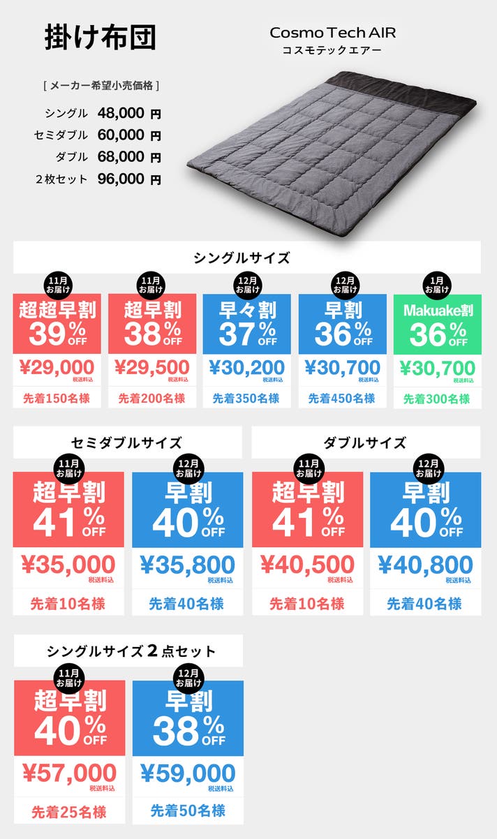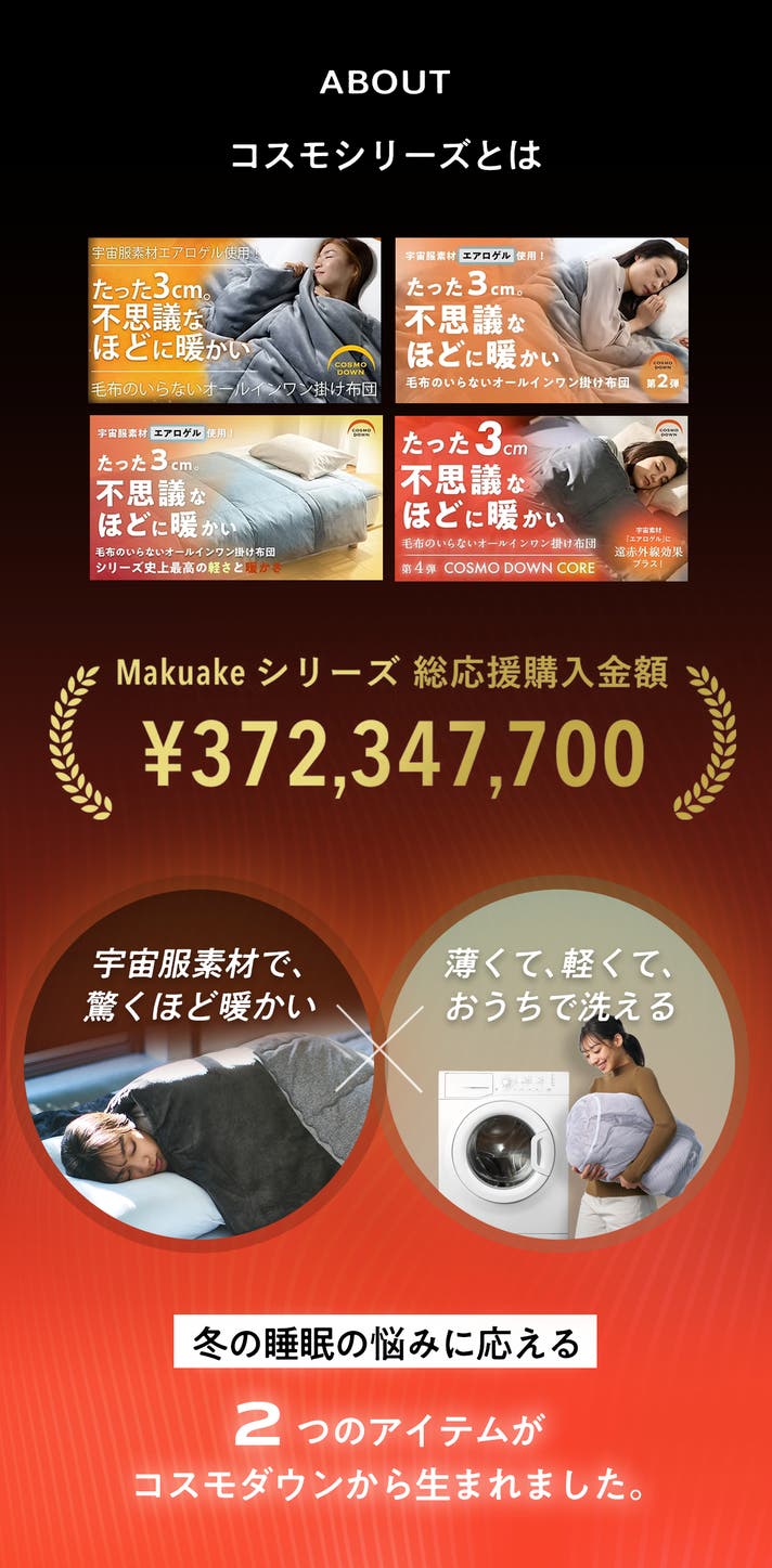 - シリーズ累計3.7億円越え。毛布のいらないオールインワン掛け布団「コスモダウン」に新モデル!
