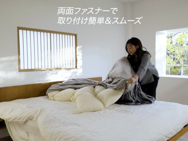 今お使いの掛け布団に『温熱毛布カバー』を取り付けるだけで、一瞬にして冬用温熱掛け布団に早変わり。両側にファスナーが付いているので、取り付けがとても簡単スムーズ。