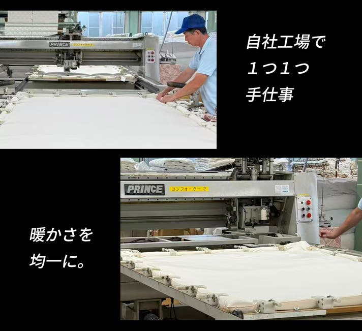 手仕事で1マス1マス羽毛を充填。マスごとの羽毛の量を均一にし、布団全体が同じ暖かさになるようにしています。