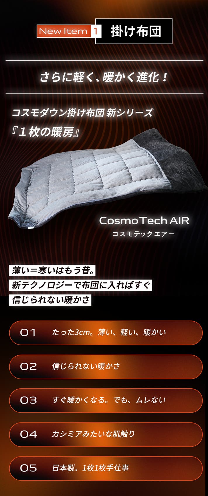 冬の寝具の煩わしさを1枚で解決した「瞬間温熱掛け布団 コスモテックエアー」と、「温熱掛け布団カバー コスモヒートカバー」が皆様の良質な睡眠や快適な生活のお役に立っていただけると信じております。