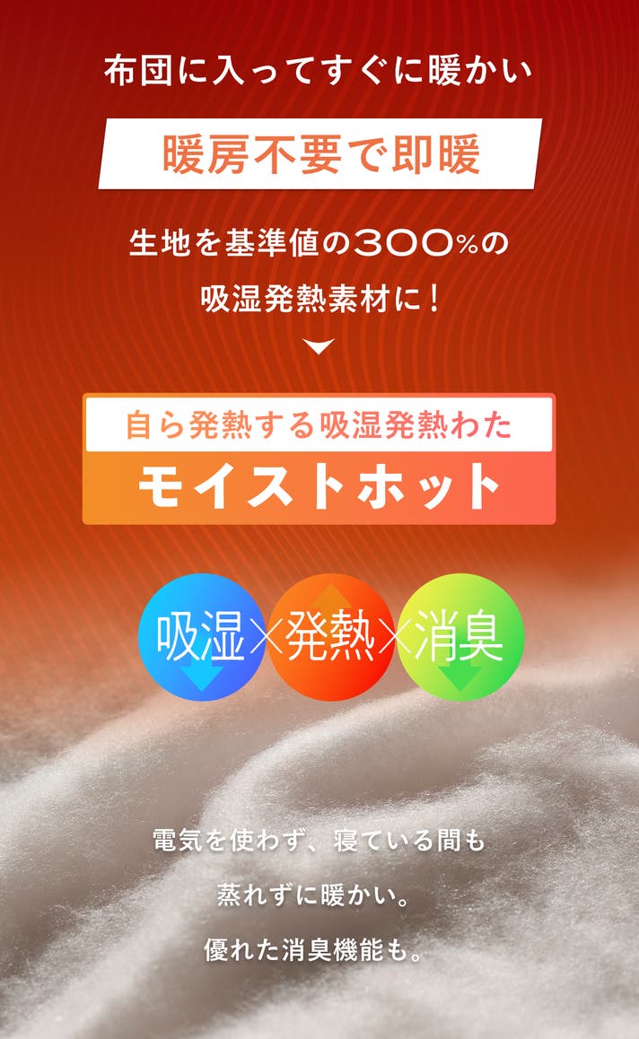 自ら発熱する吸湿発熱わた「モイストホット」。寝ている間も電気を使わず蒸れずに暖かい。優れた消臭機能もあります。