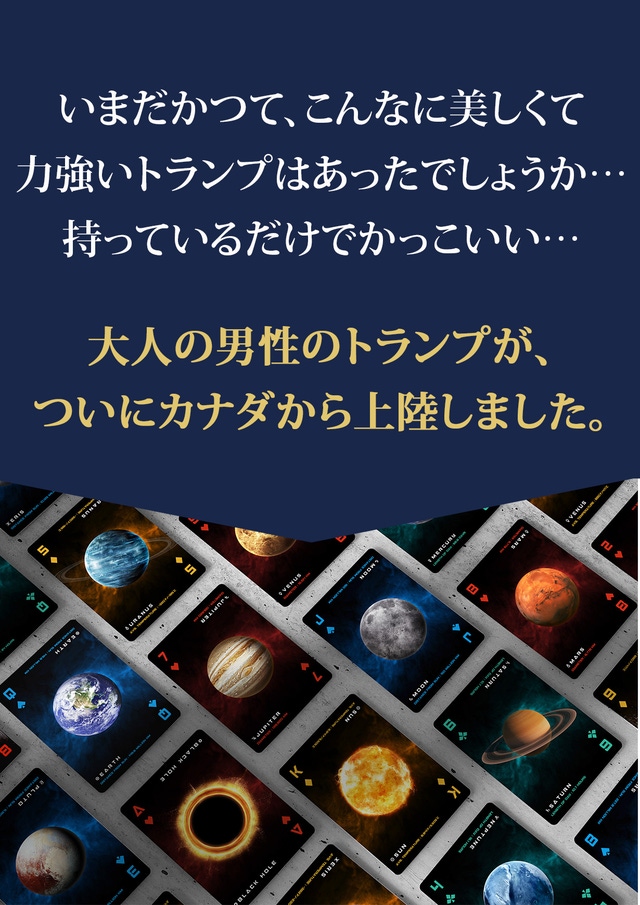 「Makuake(マクアケ)」は、実行者の想いを応援購入によって実現するアタラシイものやサービスのプラットフォームです。このページは、 プロダクトカテゴリの 「【男心をくすぐる】宇宙空間を感じるお洒落なトランプ。究極の大人の贅沢。」プロジェクト詳細ページです。