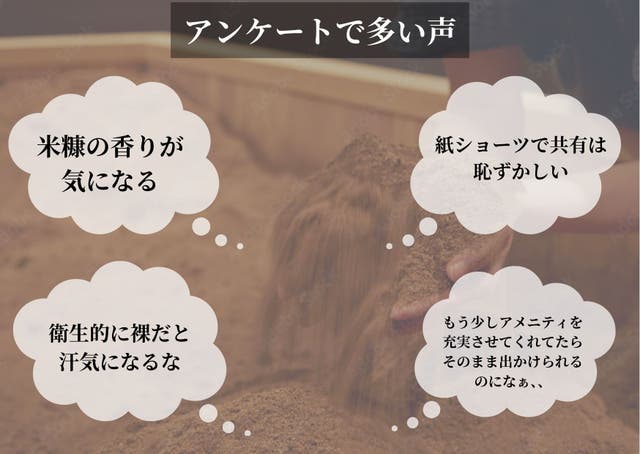 アンケート結果、自身の酵素風呂経験をもとに、今の酵素風呂で求められているものを見出しました。