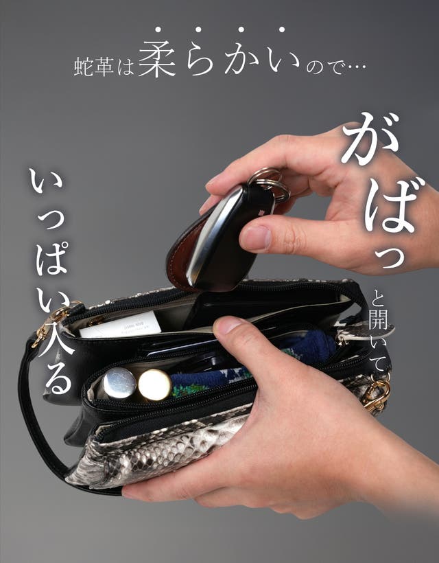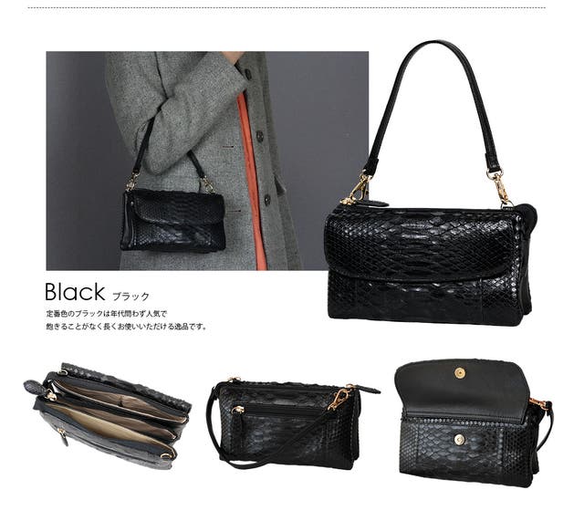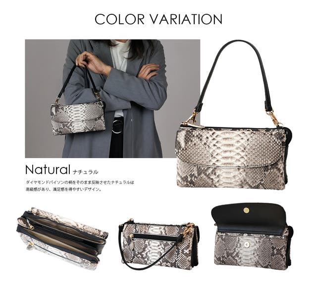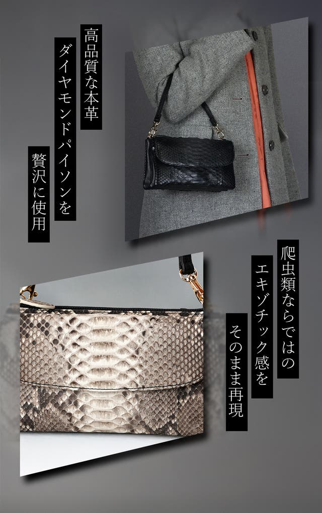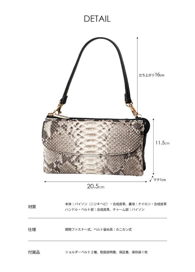 本体:パイソン(ニシキヘビ)・合成皮革、裏地:ナイロン・合皮、ハンドル・ベルト部:合皮、チャーム部:パイソン