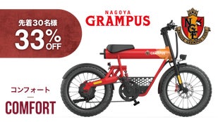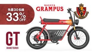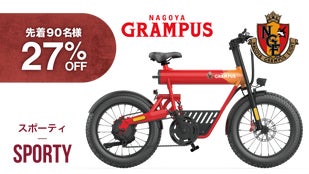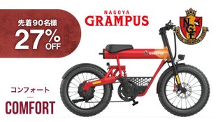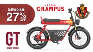 名古屋グランパスカラーの真紅とオレンジを纏った特別モデル「GRAMPUS EDITION」。COSWHEEL MIRAI E-BIKE ボディーにデザインされたグランパスのエンブレムにぜひご注目ください。最上部には王者を表す王冠、盾状のエンブレムには名古屋グランパスエイトの頭文字と名古屋のシンボル「シャチ」をデザイン。バーバリアンレッドが野生と闘魂、ノーブルレッドが知性と愛情、スターオレンジが明るさと華やかさチームスピリッツを表しています。