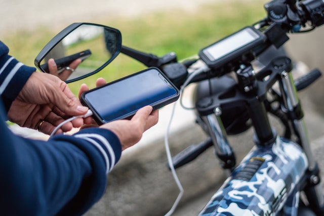 昨今のミリタリーブームを追い風に受け、トレンドとして再び注目を浴びている迷彩柄の青い海軍仕様。電動バイク×迷彩柄はワイルドかつ超個性的。