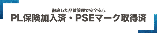届出が義務付けられているひし形PSEマーク取得済み。商品の出荷時には「抜き取り検査」ではなく、「全数検査」を実施しております。工場にて専門スタッフが1台ずつ不具合の有無を必ず確認し、品質に妥協することなく販売を行っております。また、万が一に備え事業活動包括保険(PL保険含む)に加入しております。