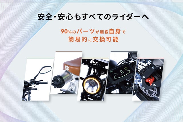 重量は約35kgと原付の半分ほど、女性でも扱いやすい驚きの軽さです。重いバッテリーを中心に前後の重量配分のバランスを考えた設計で、取り回しも楽。見た目だけでなく「走る歓び・扱いやすさ」の追求も、もちろん忘れていません。