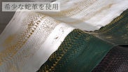 白と同様、緑に染めた蛇革に、職人が1点1点手作業で金箔を塗っています