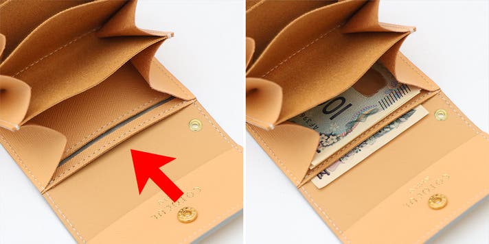 独自の構造でお札は折らずに収納ができます 【意匠登録第1598276号】