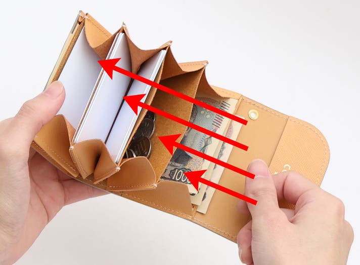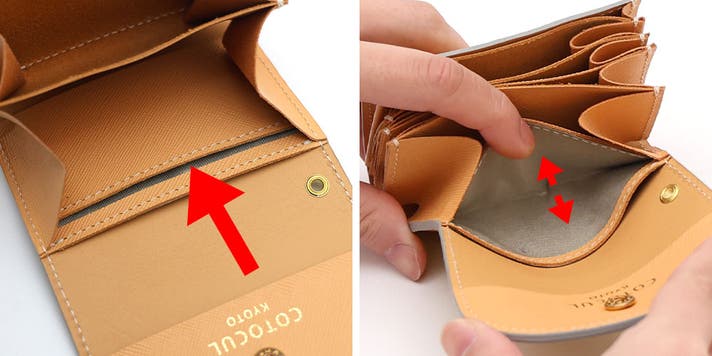 上部(図の矢印部分)にカードと小銭が収納されている為、底部がこれ以上曲がらず、お札に折り目がつかない状態を保てます