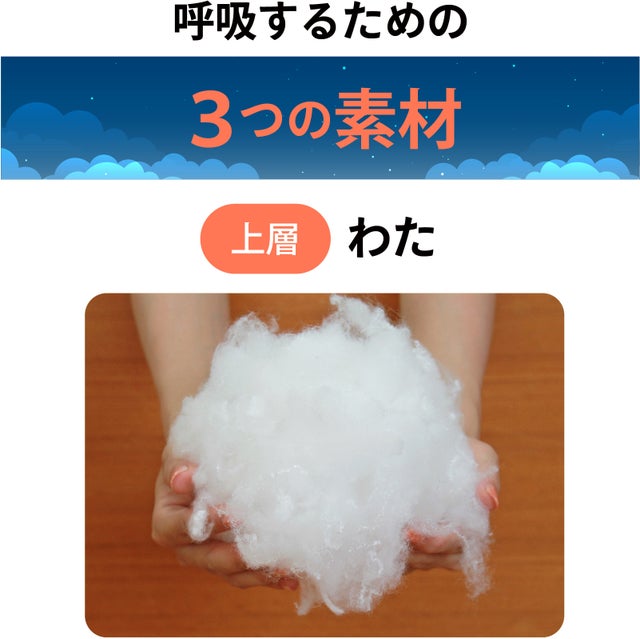 そして、わたの表面には固まりにくいコーティングを施しているので、寝返りを打っても洗濯をしても形状変化がしづらくなっています。